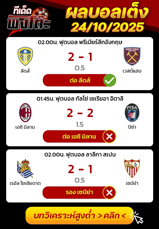 19/10/25 ชนะ ลิเวอร์พูล 2-1 (เยือน) พรีเมียร์ลีก / รอง 0.5+1 ได้