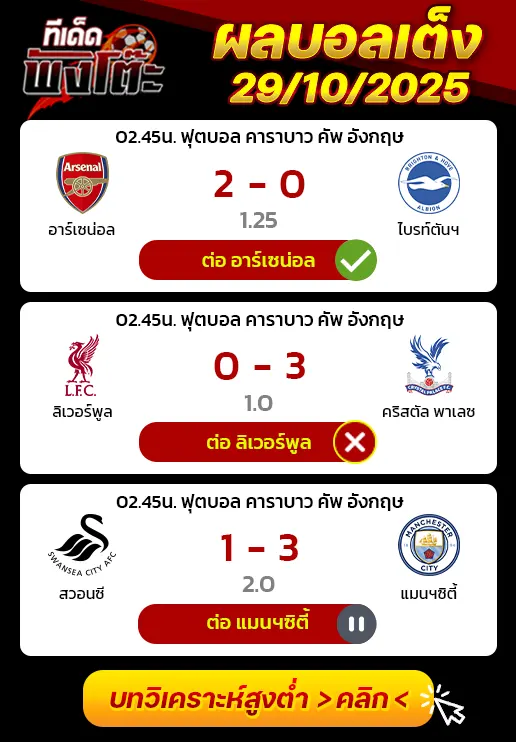26/10/25 ชนะ เวเจิ้ล 2-1 (เยือน) เดนมาร์ก ซูเปอร์ลีก้า / เสมอ ได้