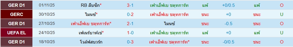 สตุ๊ตการ์ต(5นัด 8ประตู)เฟเยนูร์ด(5 นัด 18ประตู)ยูโรป้า ลีก ภาพรวมเกมนี้เจ้าบ้านเปิดเกมก่อนแน่นอน เพราะได้เล่นในบ้าน โดย 5 นัดหลังสุด สูงไป 3 เกม ทางด้านทีมเยือนเฟเยนูร์ด น่าจะมาให้รัดกุมสักหน่อย โดย 5 นัดหลังสุด สูงไป 5 เกม ราคาเปิดมาสองลูกครึ่ง ราคาสวยจัด กดโอเวอร์ไปเลย