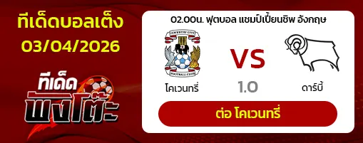 ศึกแชมป์เปี้ยนชิพ อังกฤษ ทางด้านเจ้าบ้านโคเวนทรี่ ผลงานดูดีเลย โดย 5 เกมหลังชนะ 4 แพ้ 1 ในลีกก็อยู่ที่ 1 ในส่วนทีมเยือนดาร์บี้ ผลงาน 5 เกมหลัง ไม่ต่างกันเลย โดยชนะ 4 แพ้ 1 ในลีกก็อยู่ที่ 8 ราคาเปิดมาเจ้าบ้านต่อหนึ่งลูก เป็นการเจอกันของสองทีมที่ฟอร์มกำลังร้อนแรงทั้งคู่ โคเวนทรี มีความได้เปรียบมหาศาลจากการเล่นในบ้าน ขณะที่ ดาร์บี้ แม้จะมาเยือนด้วยความมุ่งมั่นลุ้นเพลย์ออฟ