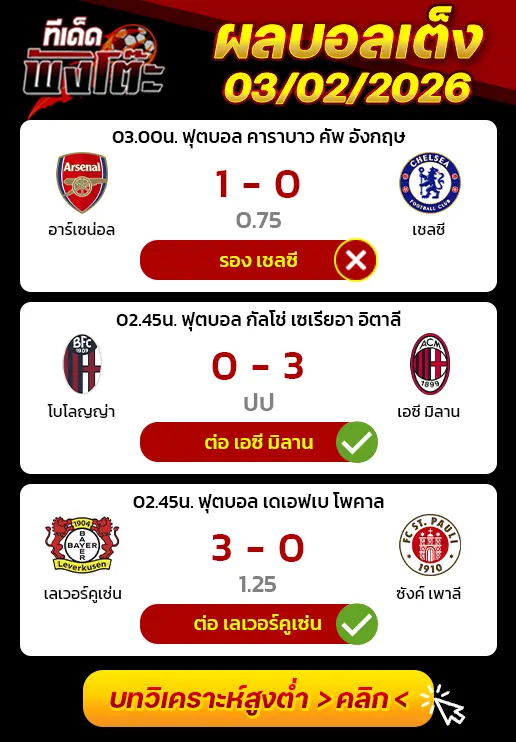 02/02/26 เสมอ สเปอร์ส 2-2 (เยือน) พรีเมียร์ลีก / ต่อ 0.5+1 เสีย