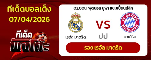 ศึกยูฟ่า แชมเปี้ยนส์ลีก รอบ8ทีมสุดท้าย (นัดแรก) ทางด้านเจ้าบ้านเรอัล มาดริด ผลงานโอเคอยู่ โดย 5 เกมหลังชนะ 4 แพ้ 1 ในลีกก็อยู่ที่ 2 ในส่วนทีมเยือนบาเยิร์น ผลงาน 5 เกมหลัง ผลงานดูดีอยู่ โดยชนะ 4 เสมอ 1 ในลีกก็อยู่ที่ 1 ราคาเปิดมาทีมเยือนต่อ ปป นี่คือเกมที่คาดเดาผลการแข่งขันได้ยากที่สุดเกมหนึ่ง เรอัล มาดริด มักจะมีพลังพิเศษเสมอเมื่อเล่นใน UCL ต่อหน้าแฟนบอลตัวเอง ส่วน บาเยิร์น หากไม่มี แฮร์รี่ เคน จะทำให้มิติในกรอบเขตโทษลดลงไปมาก