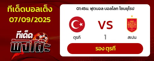 ศึกคัดบอลโลก 2026 โซนยุโรป (กลุ่ม อี) ทางด้านเจ้าบ้านตุรกี ผลงานถือว่าเอาเรื่องเลย โดย 5 เกมหลังชนะ 4 แพ้ 1 ในกลุ่มก็อยู่ที่ 2 ในส่วนทีมเยือนสเปน ผลงาน 5 เกมหลัง ถือว่าทตามมาตรฐานทีม โดยชนะ 2 เสมอ 3 ในกลุ่มก็อยู่ที่ 1 ราคาเปิดมาทีมเยือนต่อหนึ่งลูก จากการแข่งขันที่ผ่านมา แสดงให้เห็นว่าแนวรับของ สเปน ยังมีข้อผิดพลาดให้เห็นอยู่เสมอ ซึ่งอาจเป็นช่องทางให้ตุรกีฉกฉวยโอกาสทำประตูได้