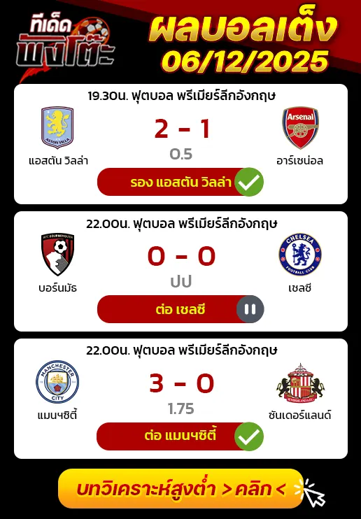 04/12/25 ชนะ เบิร์นลี่ย์ 1-0 (เยือน) พรีเมียร์ลีก / ต่อ 0.5+1 ได้ครึ่ง