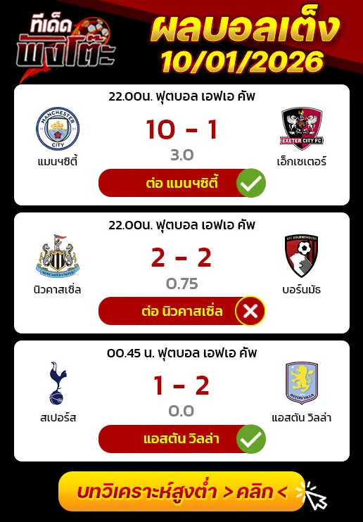 04/01/26 ชนะ บอร์นมัธ 3-2 (เยือน) พรีเมียร์ลีก / ต่อ 1+1.5 เสียครึ่ง