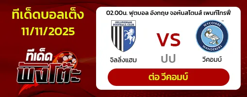 ศึกอังกฤษ จอห์นสโตนส์ เพนท์โทรฟี่ ทางด้านเจ้าบ้านจิลลิ่งแฮม ผลงานถือว่าอาการไม่ค่อยดี โดย 5 เกมหลังชนะ 1 เสมอ 2 แพ้ 2 ในลีกก็อยู่ที่ 6 ในส่วนทีมเยือนวีคอมบ์ ผลงาน 5 เกมหลัง ถือว่าเอาเรื่องเลย โดยชนะ 3 เสมอ 2 ในลีกก็อยู่ที่ 14 ราคาเปิดมาทีมเยือนต่อ ปป วีคอมบ์ ที่กำลังอยู่ในช่วงที่ฟอร์มดีเยี่ยมและมีคุณภาพทีมที่สูงกว่า ความแตกต่างของลีกและความมั่นใจของทีมยังคงเป็นปัจจัยสำคัญ