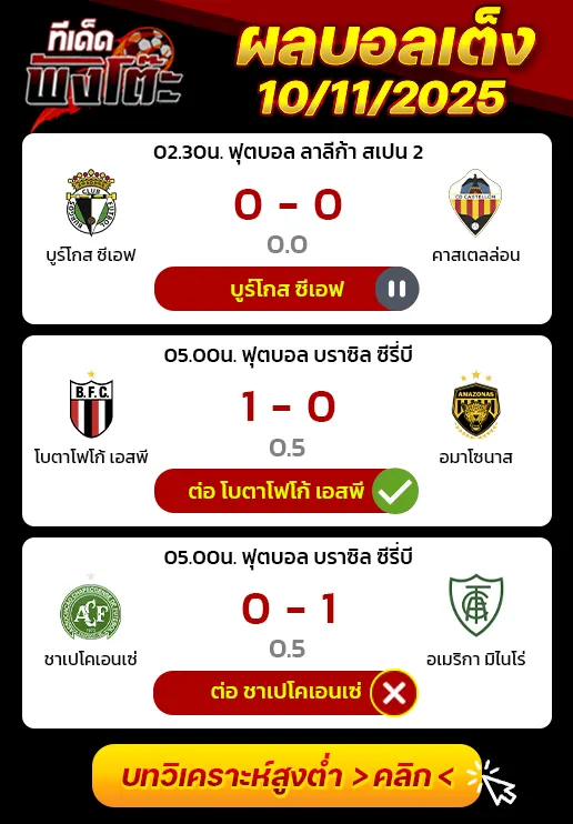 29/10/25 เสมอ แอคริงตัน 1-1 (เยือน) ลีก ทู / รอง 0+0.5 ได้ครึ่ง
