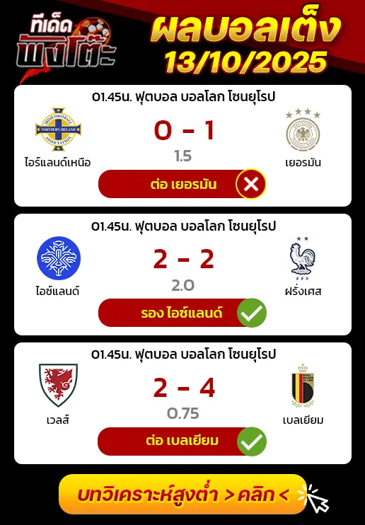 05/06/25 ชนะ เยอรมัน 2-1 (เยือน) ยูฟ่า เนชั่นส์ ลีก / รอง 0.5 ได้