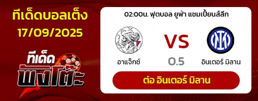 ศึกยูฟ่า แชมเปี้ยนส์ลีก ทางด้านเจ้าบ้านอาแจ็กซ์ ผลงานถือว่าเอาเรื่องเลย โดย 5 เกมหลังชนะ 3 เสมอ 2 ในส่วนทีมเยือนอินเตอร์ มิลาน ผลงาน 5 เกมหลัง ถือว่าดูโอเคอยู่ โดยชนะ 2 เสมอ 1 แพ้ 2 ราคาเปิดมาทีมเยือนต่อครึ่งลูก เกมนี้เป็นการพบกันของสองทีมที่ฟอร์มการเล่นแตกต่างกันอย่างชัดเจน อาแจ็กซ์ที่กำลังอยู่ในช่วงที่มั่นใจในการเล่นในบ้าน ขณะที่อินเตอร์ มิลาน กำลังอยู่ในช่วงที่ฟอร์มตกและมีปัญหาในเกมรับ แต่ก็ยังคงมีขุมกำลังที่แข็งแกร่งและประสบการณ์ในเวทีใหญ่ที่เหนือกว่า
