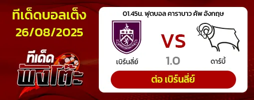ศึกคาราบาว คัพ (รอบ 2) ทางด้านเจ้าบ้านเบิร์นลี่ย์ ผลงานถือว่ากำลังโอเคเลย โดย 5 เกมหลังชนะ 3 เสมอ 1 แพ้ 1 ในส่วนทีมเยือนดาร์บี้ ผลงาน 5 เกมหลัง ถือว่าอาจจะไม่ค่อยดี โดยชนะ 2 แพ้ 3 ราคาเปิดมาเจ้าบ้านต่อหนึ่งลูก เกมนี้เป็นการพบกันของสองทีมที่มีศักยภาพแตกต่างกันอย่างชัดเจน เบิร์นลี่ย์มีทั้งประสบการณ์และคุณภาพของนักเตะที่เหนือกว่า ทำให้พวกเขามีโอกาสที่จะคว้าชัยชนะในเกมนี้ไปได้อย่างไม่ยากเย็นนัก