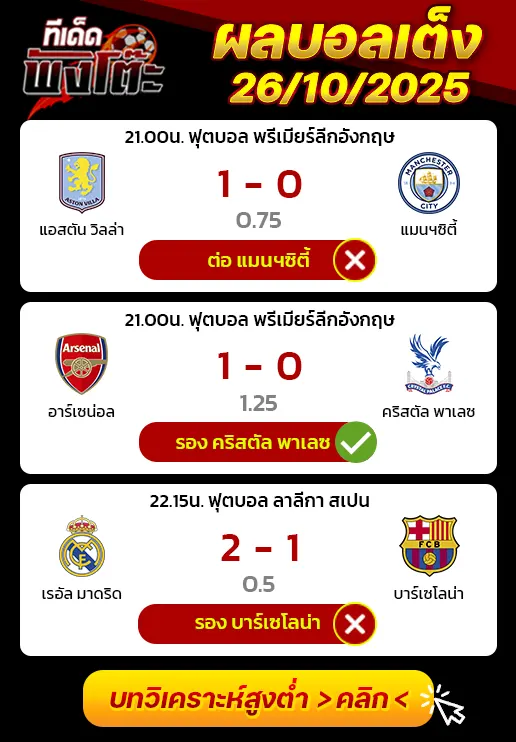 27/09/25 ชนะ คาซ่า เปีย 2-1 (เหย้า) โปรตุเกส ปรีเมร่า ลีก้า /ต่อ 0+0.5 ได้