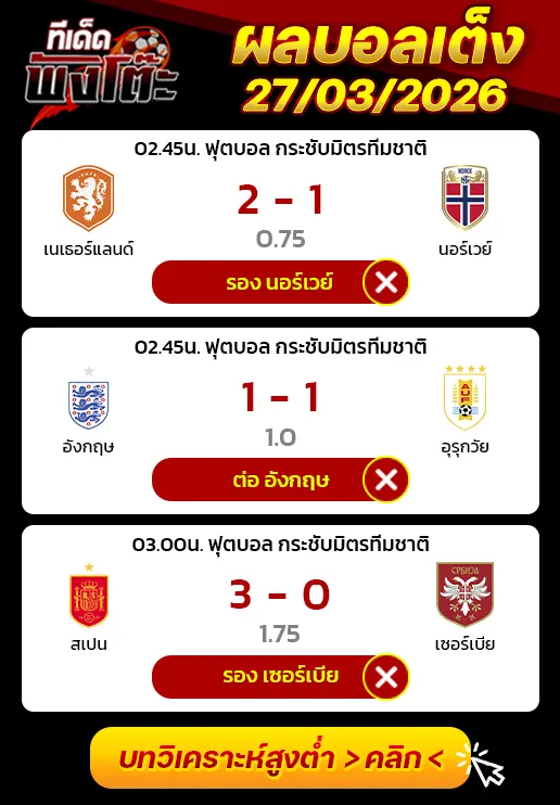 16/11/25 แพ้ ไอร์แลนด์ 2-3 (เหย้า) คัดบอลโลก 2026 / ต่อ 0.5 เสีย