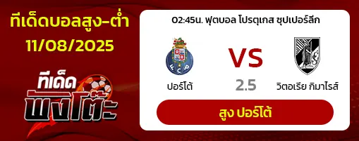 ปอร์โต้(5นัด 8ประตู)วิตอเรีย กิมาไรส์(5 นัด 7ประตู)โปรตุเกส ซุปเปอร์ลีก ภาพรวมเกมนี้เจ้าบ้านเปิดเกมก่อนแน่นอน เพราะได้เล่นในบ้านและกำลังมั่นใจ โดย 5 นัดหลังสุด สูงไป 3 เกม ทางด้านทีมเยือนวิตอเรีย กิมาไรส์ น่าจะมาแพ็คหลังให้แน่น โดย 5 นัดหลังสุด สูงไป 3 เกม ราคาเปิดมาสองลูกครึ่ง ราคามาดี กดสูงไปเลย