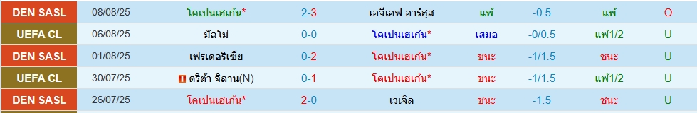 โคเปนเฮเก้น(5นัด 7ประตู)มัลโม่(5นัด 9ประตู)ยูฟ่า แชมเปี้ยนส์ลีก รอบคัดเลือก (นัดสอง) ภาพรวมเกมนี้เป็นคาดว่าเจ้าบ้านเป็นฝ่ายเปิดเกมบุกใส่ เพราะได้เล่นในบ้านและฟอร์มก็ดีขึ้นเรื่อยๆ โดย 5 นัดหลังสุด สูงไป 1 เกม ทางด้านทีมเยือนมัลโม่ น่าจะมาเล่นให้รัดกุม เพราะเป็นรองอยู่หน่อย โดย 5 นัดหลัง สูงไป 3 เกม ราคาเปิดมาสองลูกครึ่ง ราคาดีเลย น่าจะไปโอเวอร์