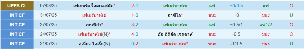 เฟเนร์บาห์เช่(5นัด 10ประตู)เฟเยนูร์ด(5 นัด 9ประตู)ยูฟ่า แชมเปี้ยนส์ลีก รอบคัดเลือก (นัดสอง) ภาพรวมเกมนี้เจ้าบ้านเปิดเกมก่อนแน่นอน เพราะไเกมแรกโดนมาก่อนและได้เล่นในบ้านอีก โดย 5 นัดหลังสุด สูงไป 3 เกม ทางด้านทีมเยือนเฟเยนูร์ด น่าจะมาแพ็คให้แน่นและพเล่นเกมโต้กลับ โดย 5 นัดหลังสุด สูงไป 3 เกม ราคาเปิดมาสามลูก ราคามาโอเคเลย กดโอเวอร์ไปเลย