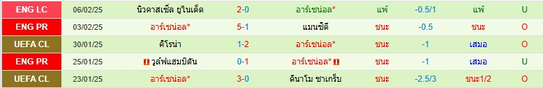 06/02/25 ชนะ อาร์เซน่อล 2-0 (เหย้า) ลีก คัพ / รอง 0.5+1 ได้ (ต่ำ)
