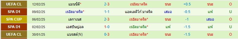 12/02/25 แพ้ เรอัล มาดริด 2-3 (เหย้า) ยูฟ่า แชมเปี้ยนส์ ลีก / ต่อ 0.5 เสีย (สูง)