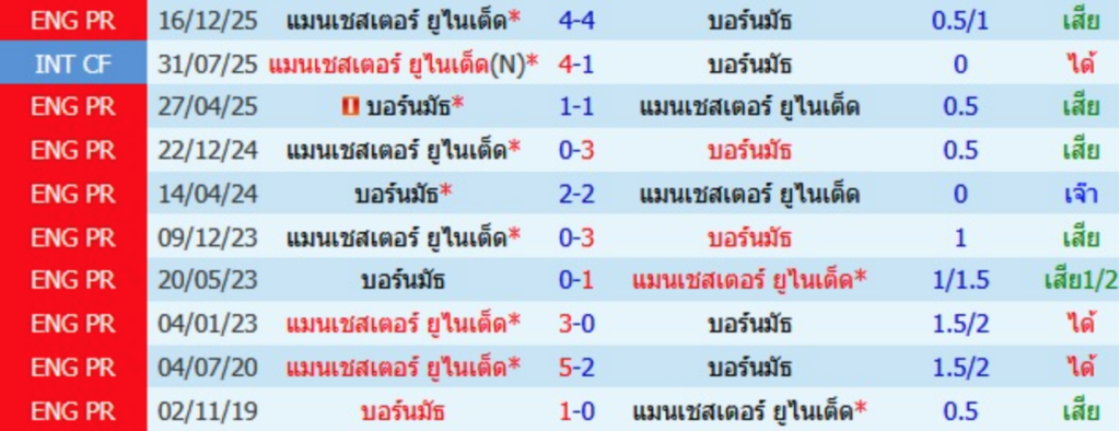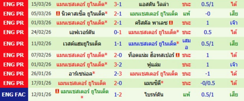 แมนฯยู กำลังเครื่องแรง หลังกำชัย 7 จาก 9 เกมลีกที่ผ่านมา (เสมอ 1, แพ้ 1) ทว่าสถิติในฐานะอาคันตุกะตลอด 7 เกมลีกท้าย กลับคว้าชัยได้เพียง 2 คราเท่านั้น (เสมอ 3, แพ้ 2) และโดนยิงรวม 10 ตุงถ้วน แถมเจอกันล่าสุดที่ โอลด์ แทร็ฟฟอร์ด ก็เจ๊าเดือด 4-4 ในยุคของ รูเบน อาโมริม อีกด้วย เมื่อพิจารณาจากหน้าเสื่อกับภาพรวมต่าง ๆ มีโอกาสออกสกอร์สูงแน่นอน