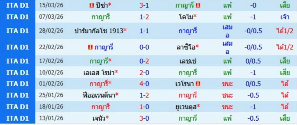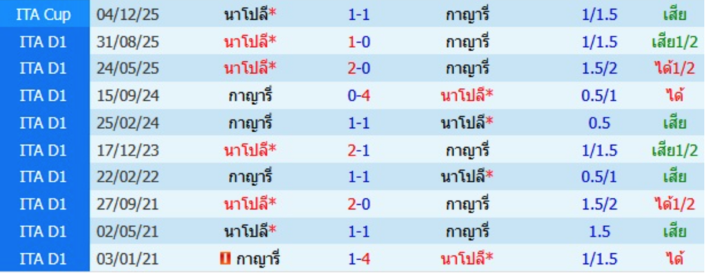 กายารี่ ยังต้องดิ้นรนอย่างหนักเพื่อหนีตายแต่สถานการณ์ไม่สู้ดีเลยเพราะไม่ชนะใครมาแล้ว 6 นัดติดต่อกัน วันนี้ถึงแม้จะได้เล่นในบ้าน แต่การรับมือกับ นาโปลี ก็จัดว่าเป็นงานที่ยาก เพราะฟอร์มกำลังยอดเยี่ยม ชนะมา 3 เกมติด ตัวที่เจ็บเริ่มทยอยกลับมาแล้ว ดูแล้วเกมนี้โอกาสออกสกอร์สูงแน่นอน