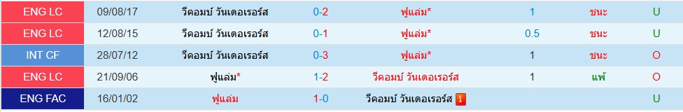วีคอมบ์(5นัด 10ประตู)ฟูแล่ม(5นัด 4ประตู)คาราบาว คัพ ภาพรวมเกมนี้เป็นคาดว่าทีมเยือนเป็นฝ่ายเปิดเกมบุกใส่ เพราะต้องเรียกความมั่นใจ โดย 5 นัดหลังสุด สูงไป 3 เกม ทางด้านเจ้าบ้านวีคอมบ์ น่าจะมาเล่นให้รัดกุม โดย 5 นัดหลัง สูงไป 3 เกม ราคาเปิดมาสองลูกครึ่ง ราคาโอเคเลย กดโอเวอร์ได้เลย