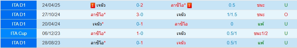 เจนัว(5นัด 5ประตู)ลาซิโอ(5 นัด 6ประตู)กัลโช่ เซเรียอา อิตาลี ภาพรวมเกมนี้เจ้าบ้านเปิดเกมก่อนแน่นอน เพราะได้เล่นในบ้าน โดย 5 นัดหลังสุด ต่ำไป 3 เกม ทางด้านทีมเยือนลาซิโอ น่าจะมาเล่นให้รัดกุม โดย 5 นัดหลังสุด ต่ำไป 4 เกม ราคาเปิดมาสองลูกครึ่ง เกมรุกมีปัญหาทั้งคู่ กดต่ำไปเลย