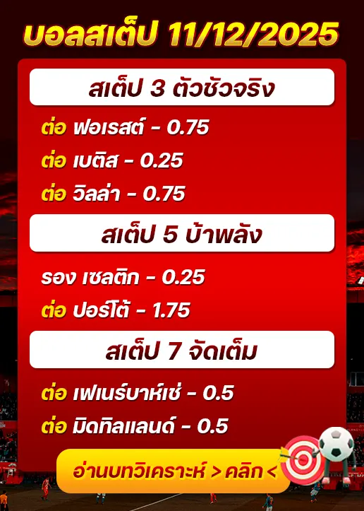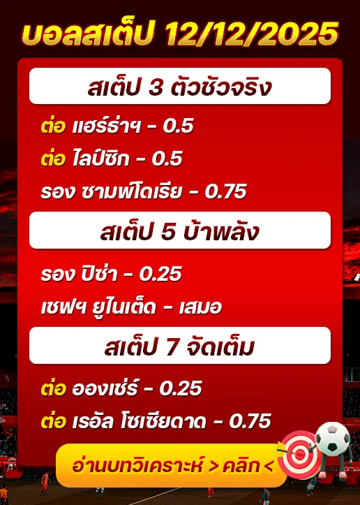 บอลสเต็ปประจำวันที่ 14/12/25 ต่อ แมนฯซิตี้ 0.5 ถ้าหน้าเสื่อเปิดมาสูงมากกว่านี้ ก็คงต้องขอเชียร์เจ้าบ้านสุดใจไปเหมือนกัน ทว่าเรตที่เปิดมาขอเพียงแค่สามคะแนนสำหรับทีมเยือน แมนฯซิตี้ บอกเลยว่าไม่ยากเกินหวัง แม้เจ้าถิ่น คริสตัล พาเลซ กำลังเครื่องแรงเก็บชัยรวด […]